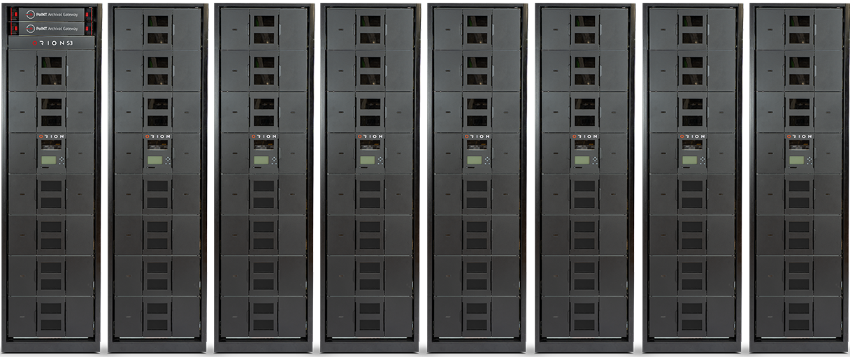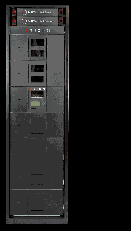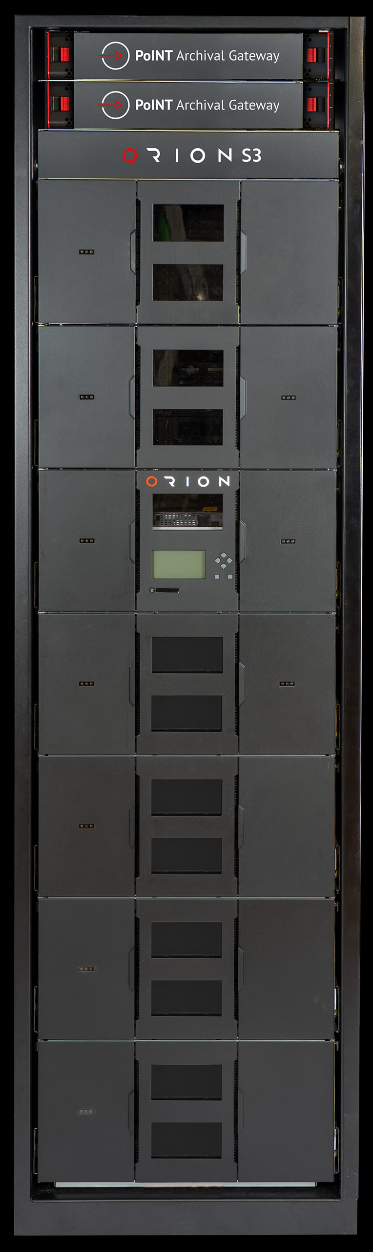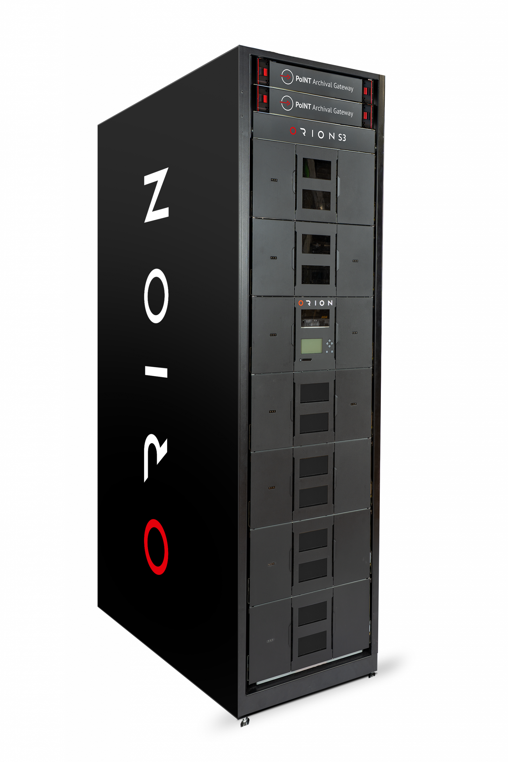 Die ORION S3 ist auf große Datenmengen in einem Rack ausgelegt. Sie fasst im Grundausbau bis zu 974 Tapes mit bis zu 3 LTO–FH-Laufwerken im Basis-Rack. Unterstützt werden die LTO-Technologien 8, 9 und 10. Sollten mehr Laufwerke benötigt werden, so gibt es die ORION S3 mit bis zu 21 LTO-FH-Laufwerken im Basis Rack. Andere Konfigurationen sind selbstverständlich möglich. Je nach Anwendungsfall können mehr Laufwerke oder mehr Tape Stellplätze konfiguriert werden. Der PoINT Archival Gateway als integrierter S3-Kopf skaliert die ORION S3 auf bis über 8.000 Tape Stellplätzen.